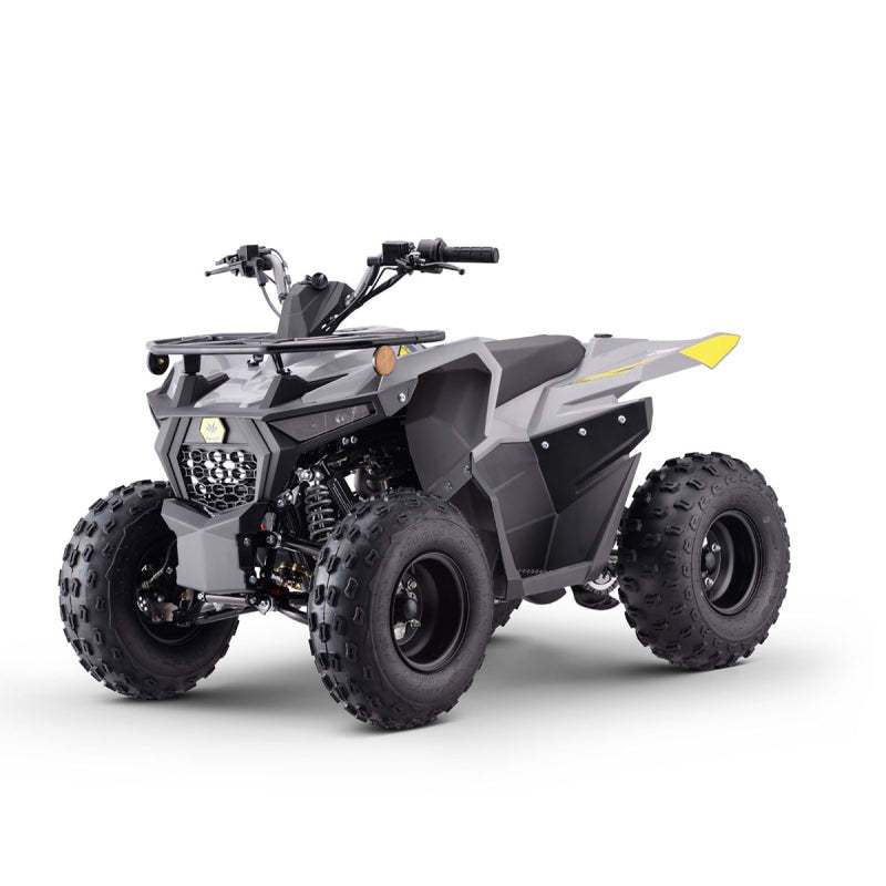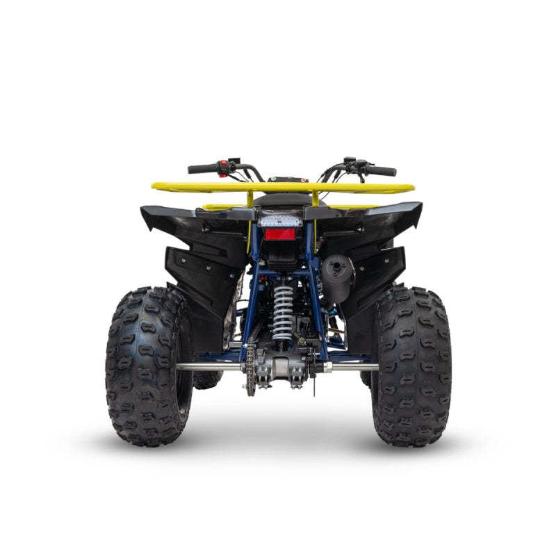Il nostro quad è equipaggiato con un motore 4 tempi monocilindrico con retromarcia, raffreddato ad aria e dalla cilindrata di 125cc, funzionante a benzina verde. Dispone di avviamento elettrico e cambio automatico a 3 rapporti con retromarcia, con trasmissione a catena per prestazioni affidabili.